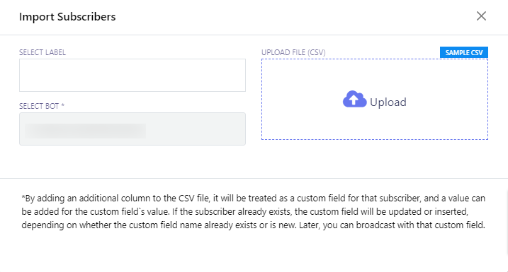 • A modal form called `Import Subscribers` will appear with two fields: `Select Label` and `Select Bot`.